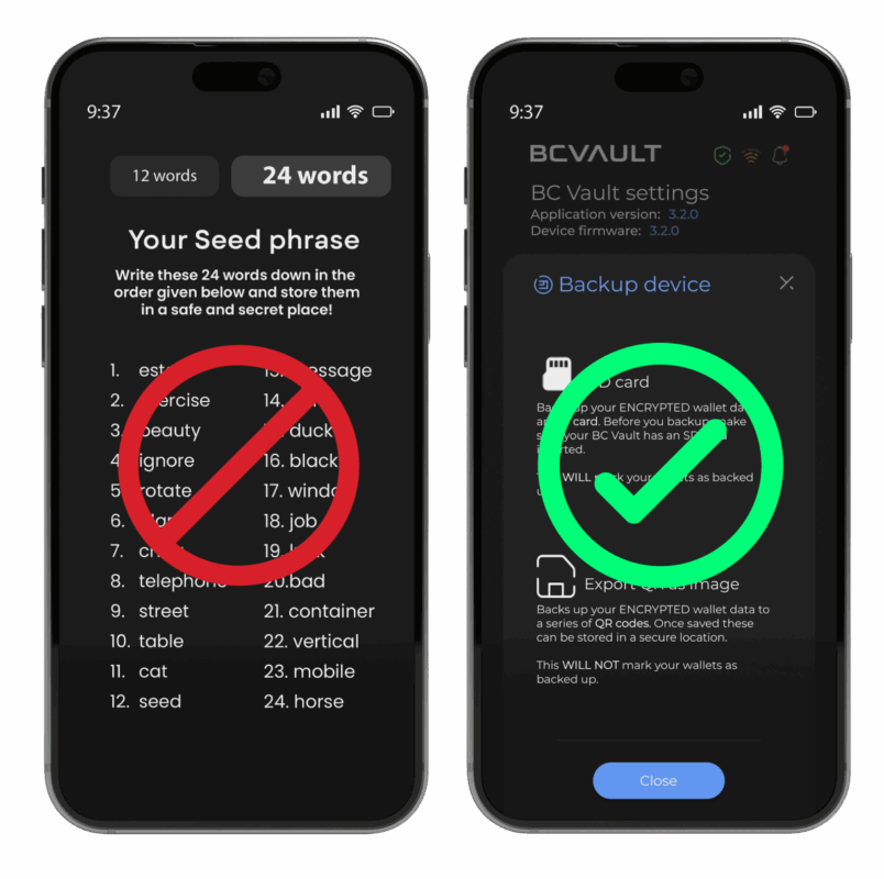 Unlike traditional wallets, BC Vault doesn’t rely on vulnerable seed phrases. All private keys are securely encrypted and backed up, eliminating one of the most common attack vectors in crypto.