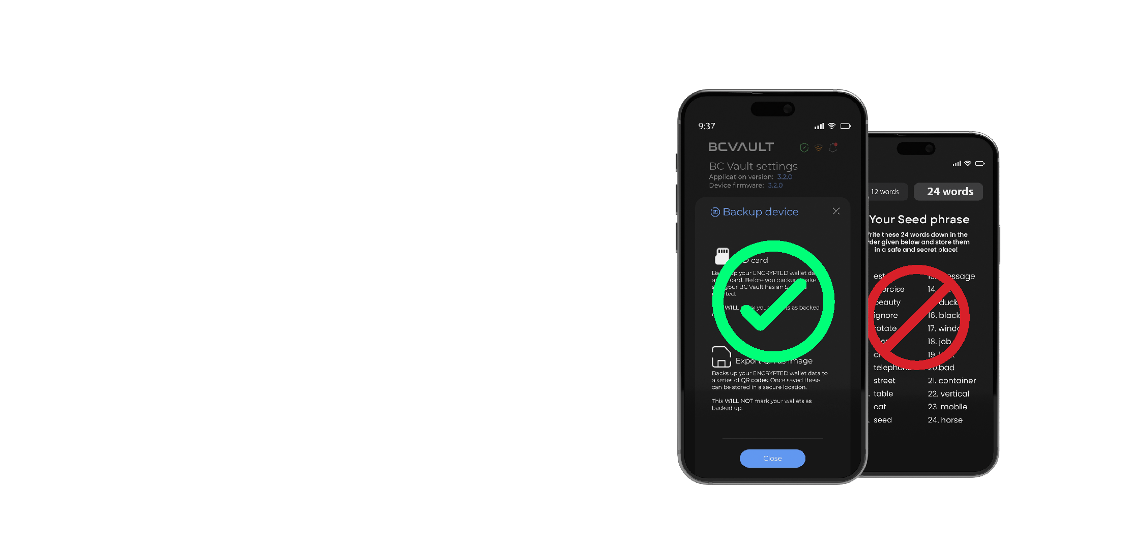 Your private keys are backed up securely as encrypted QR codes or on a MicroSD card, ensuring you can always recover your assets.